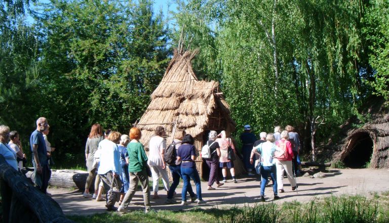 Jeszcze Biskupin! Tutaj niespodzianka dla tych co tutaj kiedyś byli. Cały teren podzielono na okresy od epoki kamiennej, przez epokę brązu do epoki żelaza. Wszędzie odtworzone obiekty mieszkalne, poletka uprawne, sprzęty gospodarskie, warsztaty tkackie, garncarskie i wszędzie są osoby w odpowiednim odzieniu demonstrujące wykonywane tam prace. Oczywiście osada Biskupińska oraz wały obronne są wyłożone drewnem przez co ulice robią wrażenie, wyposażenie chat także.